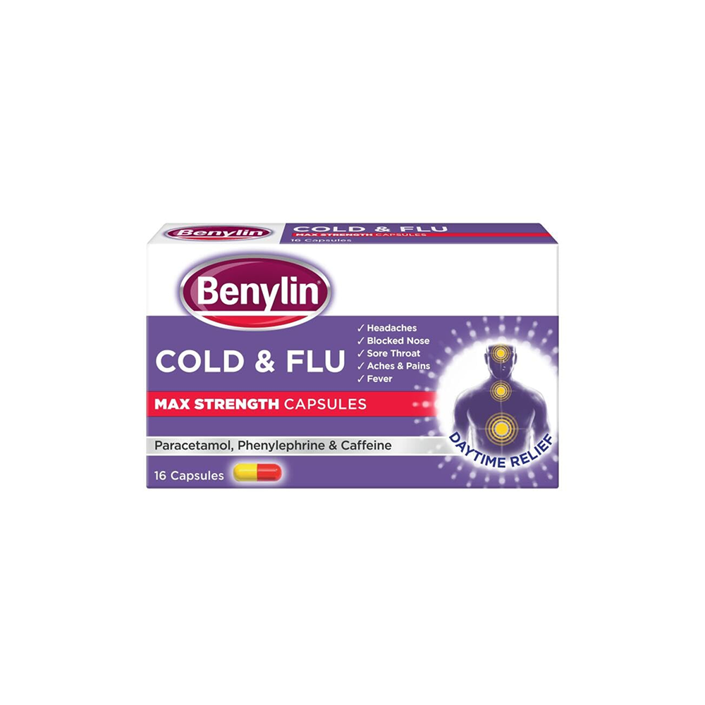 Benylin Cold and Flu Max Capsules offer comprehensive symptom relief to help you feel better fast during cold and flu episodes. These capsules contain paracetamol to ease pain and fever, caffeine to reduce tiredness, and phenylephrine to clear nasal passages. Ideal for treating headaches, sore throat, body aches, chills, and sinus discomfort, they are formulated to be non-drowsy so you can stay alert throughout the day. The 16-capsule pack provides several doses for ongoing relief, helping you recover faster and more comfortably.