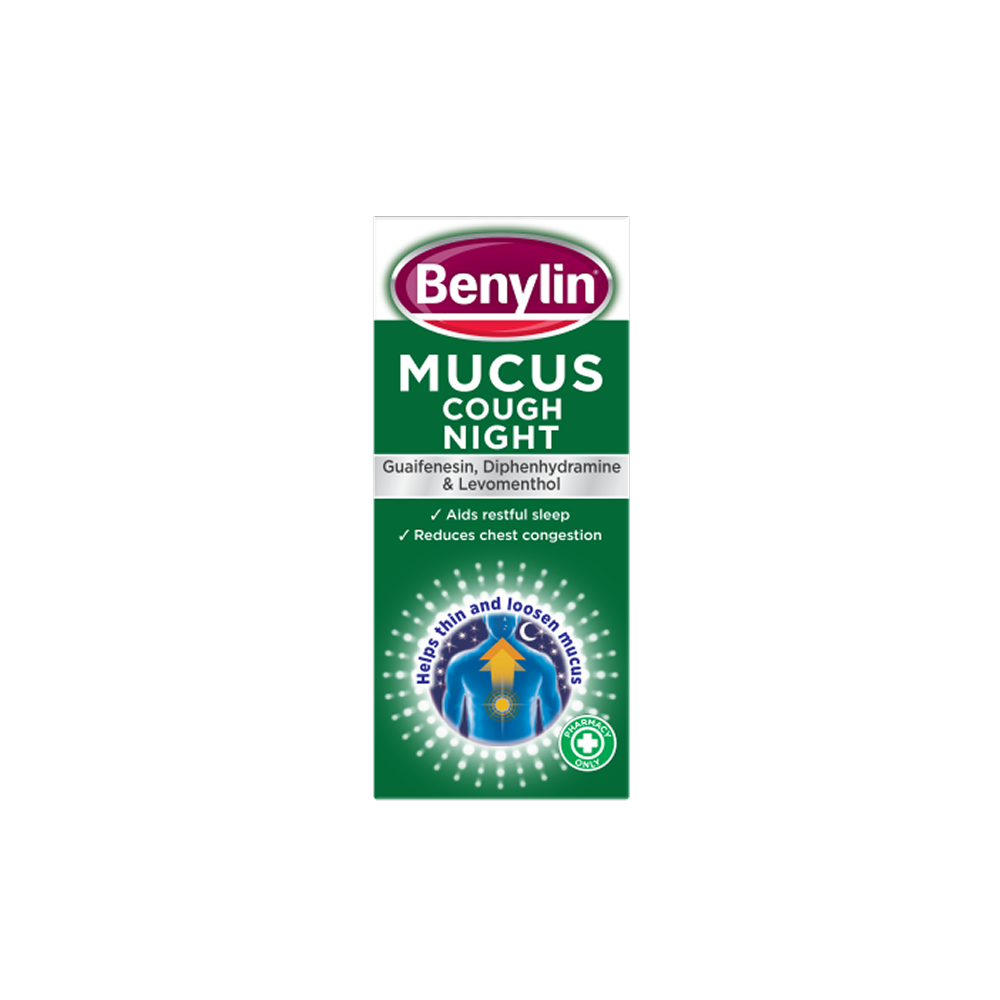 Benylin Mucus Cough Night Syrup helps relieve chesty coughs while aiding sleep. It contains guaifenesin to loosen mucus and diphenhydramine, a sedating antihistamine that calms coughing. This nighttime formula is ideal for adults and children over 12 who need help resting and breathing easier through the night.
