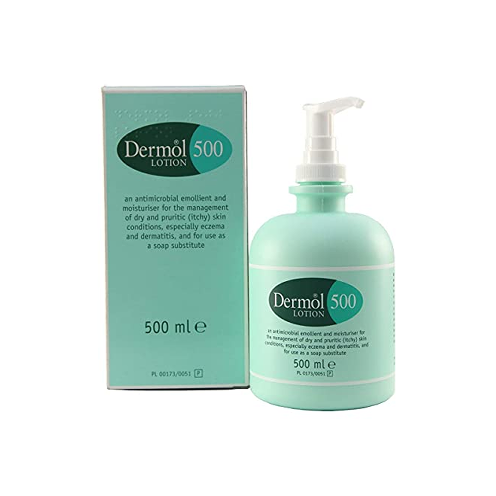 Dermol 500 Lotion 500ml is a dual-purpose emollient and cleanser formulated to treat dry, sensitive, and eczema-prone skin. It contains antimicrobial agents to reduce bacteria on the skin and prevent secondary infections. Suitable for daily use in the bath or as a soap substitute, it provides intense hydration and relieves itching and irritation.