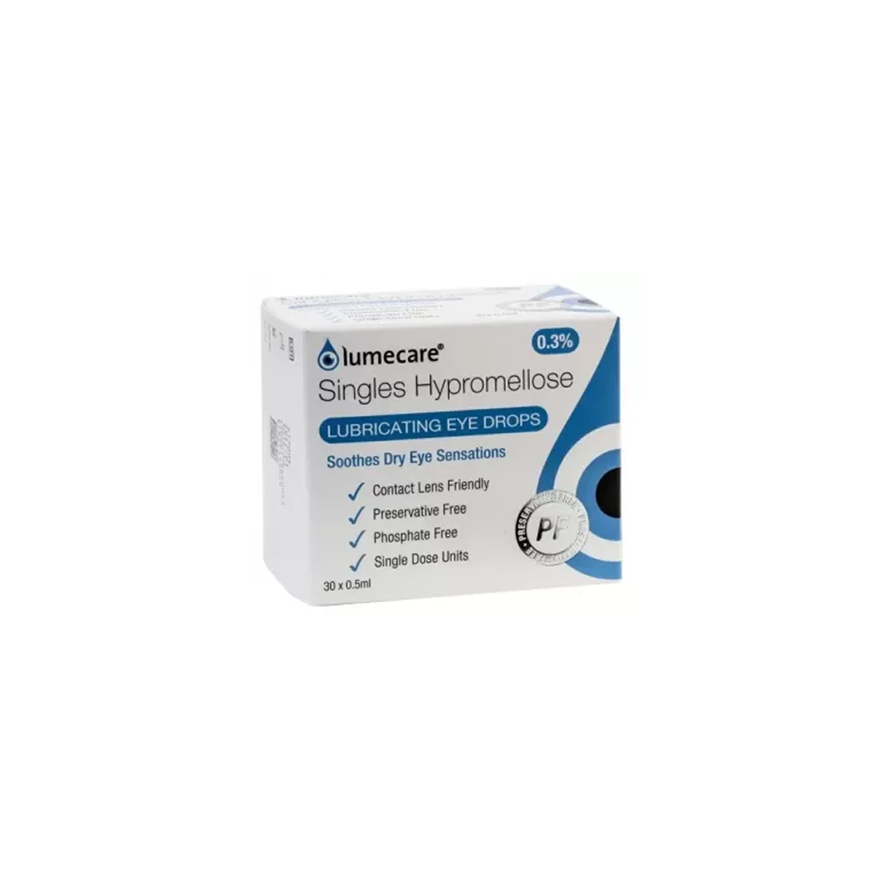 Lumecare Hypromellose Eye Drops 0.3% Single Doses – 30 Pack are specially formulated to relieve symptoms of dry eyes caused by environmental factors, contact lens wear, or screen use. Each single-dose vial contains 0.3% hypromellose, a gentle lubricant that moisturises and protects the eye’s surface, helping to reduce discomfort, irritation, and dryness.